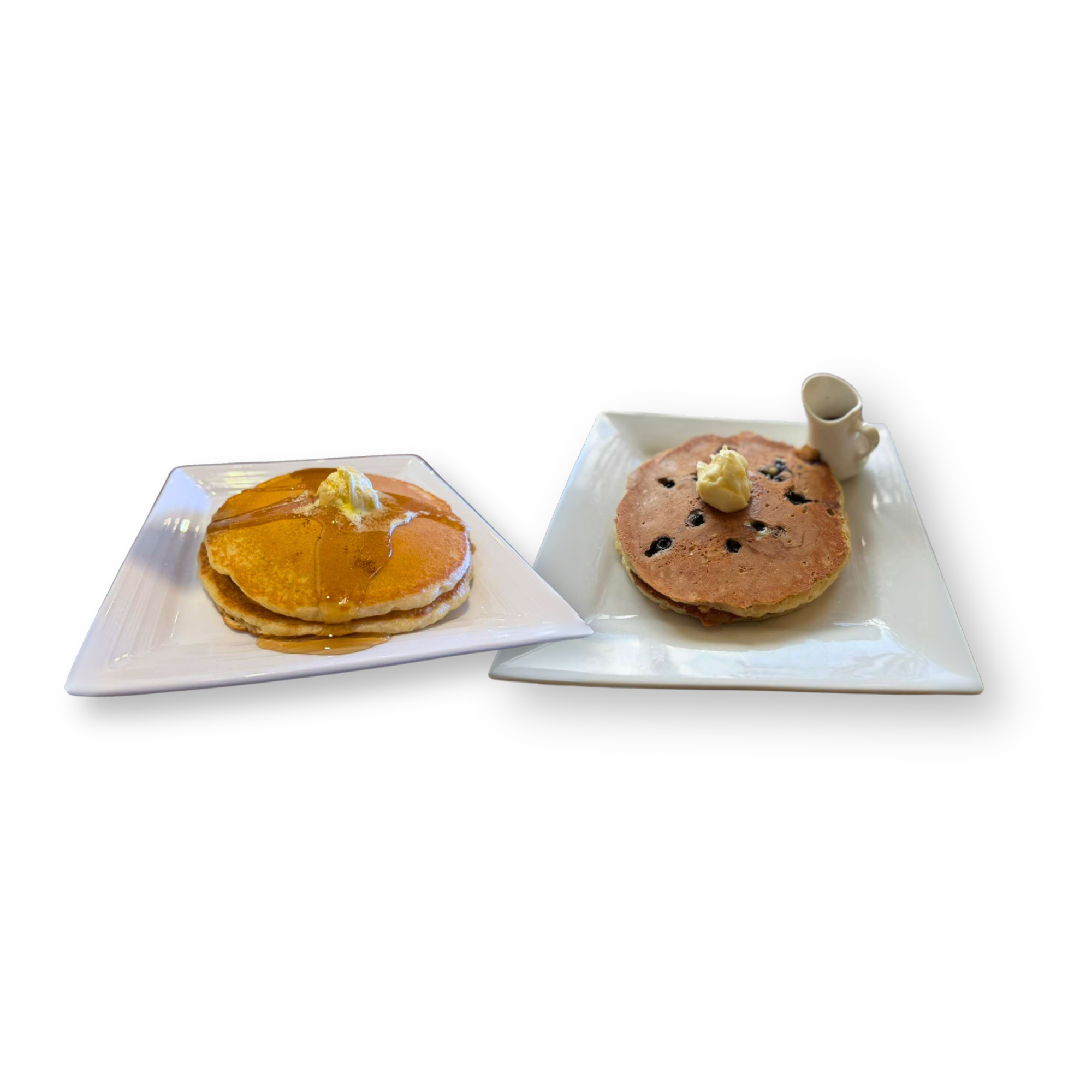 Two blueberry pancakes, 2 eggs any style, choice of meat, with hash browns or home potatoes.