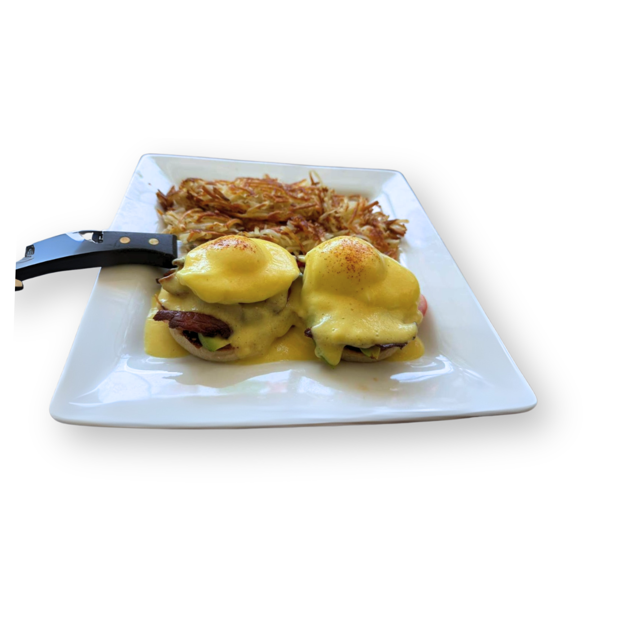 Two poached eggs with crispy bacon, fresh tomato, avocado, topped with hollandaise sauce. Served with home potatoes or hash browns.