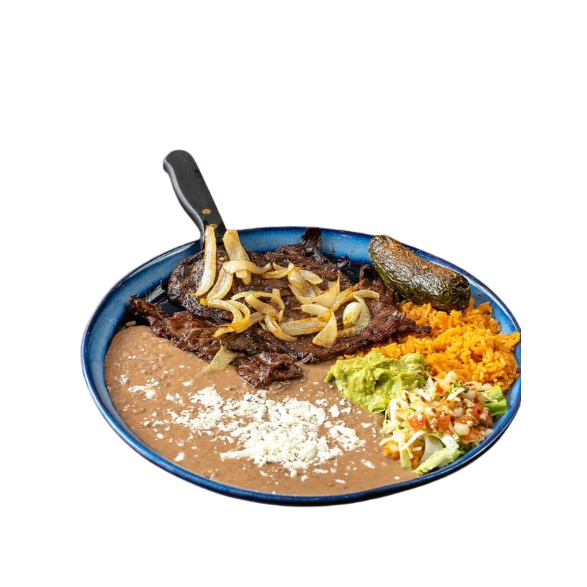 Thinly sliced Angus skirt steak, grilled to perfection and served with fried jalapeño, guacamole, rice, beans and warm tortillas. Shrimp available.