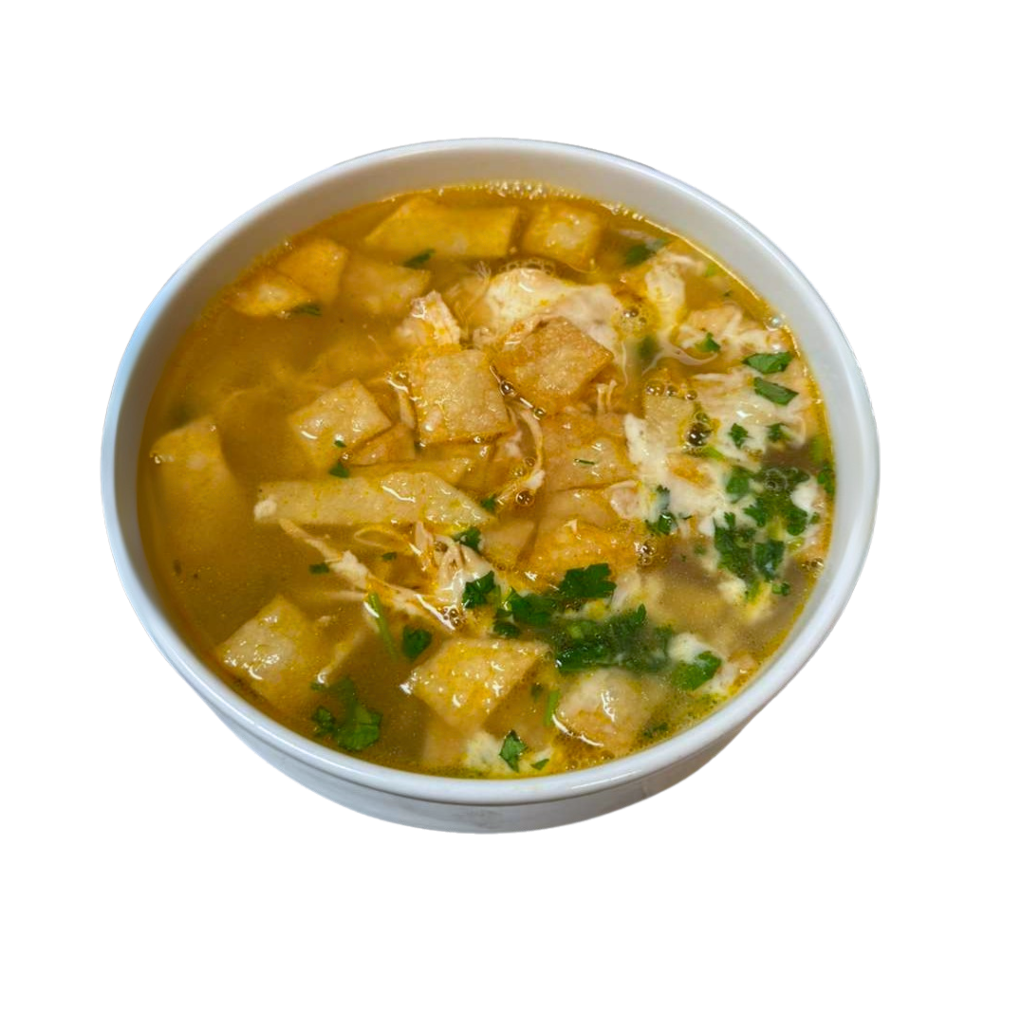Shredded chicken breast with tomatoes and onions in a savory broth, topped with avocado, crispy tortilla chips, shredded cheese and sour cream.