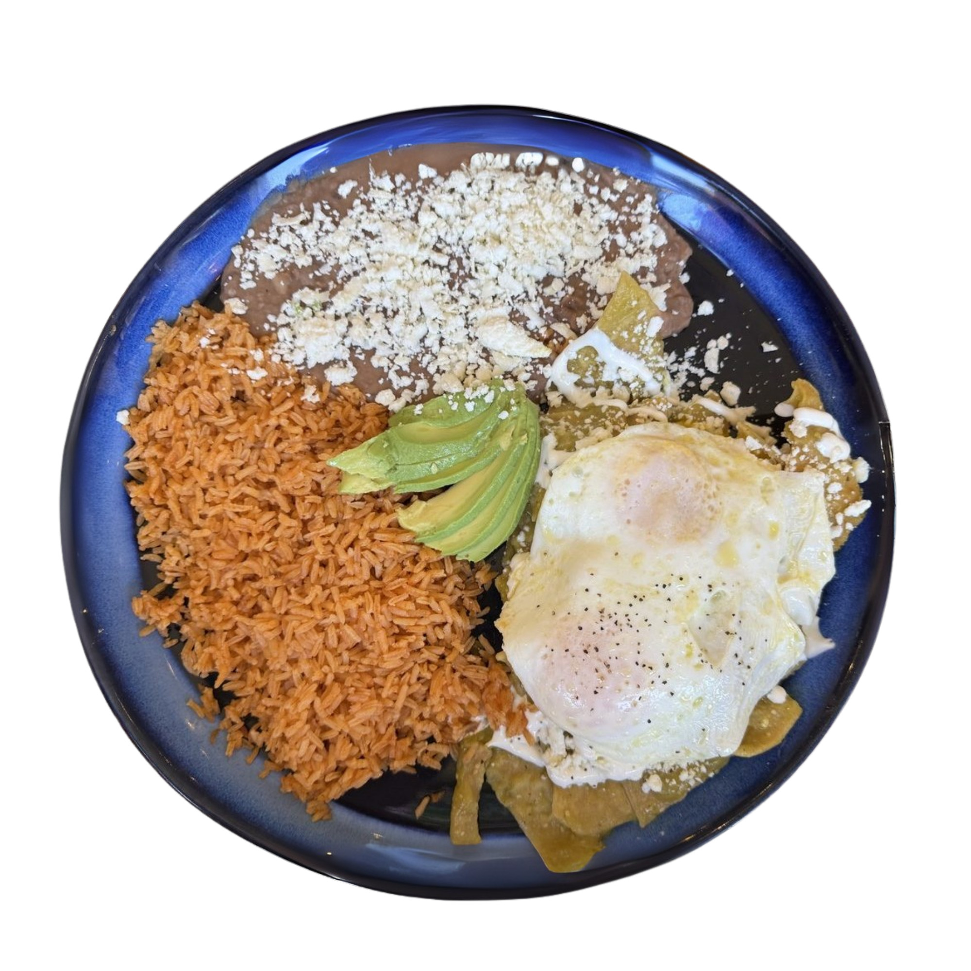 Crispy tortilla chips tossed in red or green salsa, topped with two eggs any style, queso fresco, and sour cream. Served with rice and beans.